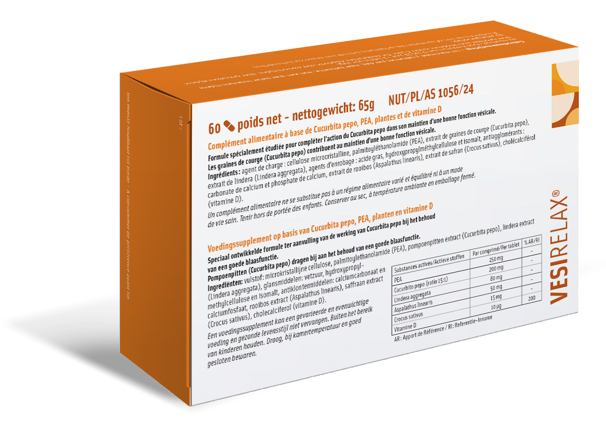 VESIRELAX® est une formule naturelle unique conçue pour l’équilibre de la vessie et la maîtrise urinaire.